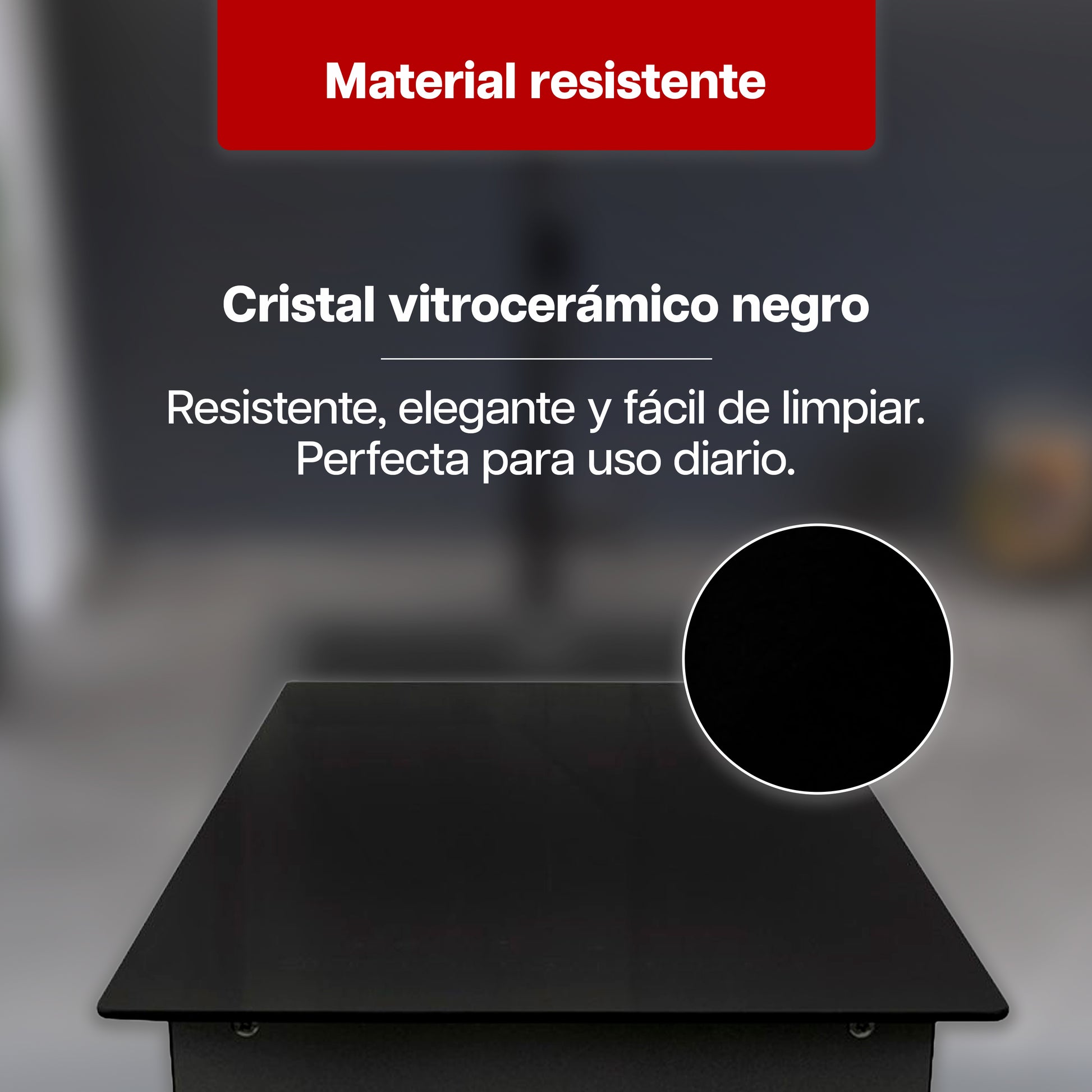 - Material de la cubierta: Cristal negro, fácil de limpiar y con un acabado moderno.